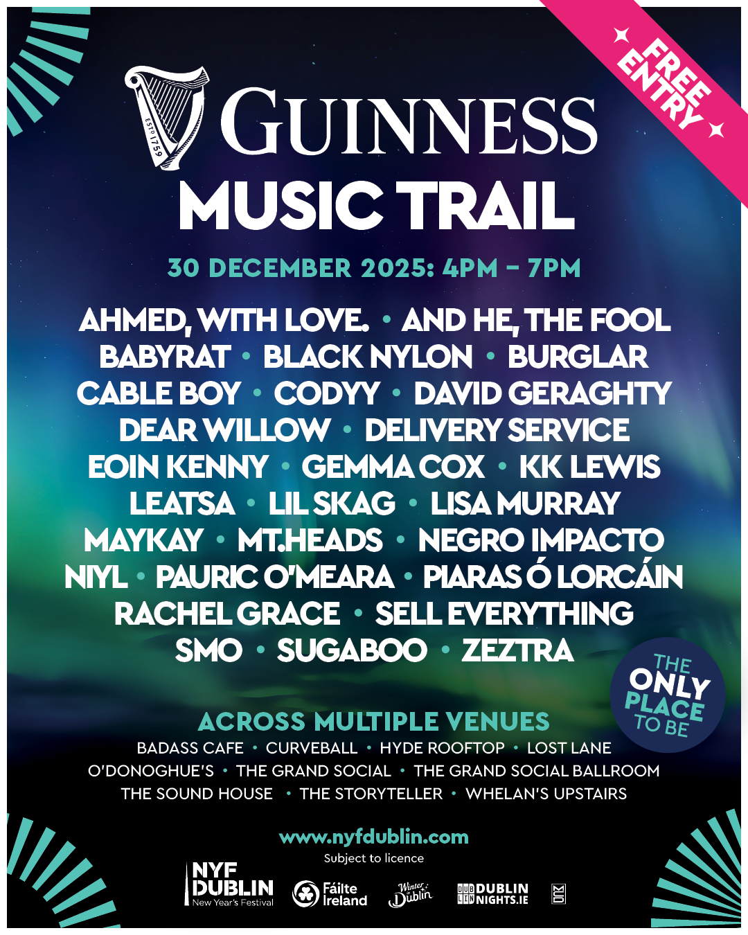 Follow Dublin’s vibrant Guinness Music Trail featuring live performances from Ireland’s up and coming musicians who will perform across a host of Dublin venues. This free event is set to takes on 30 December 2025 in some of Dublin’s best live music venues.